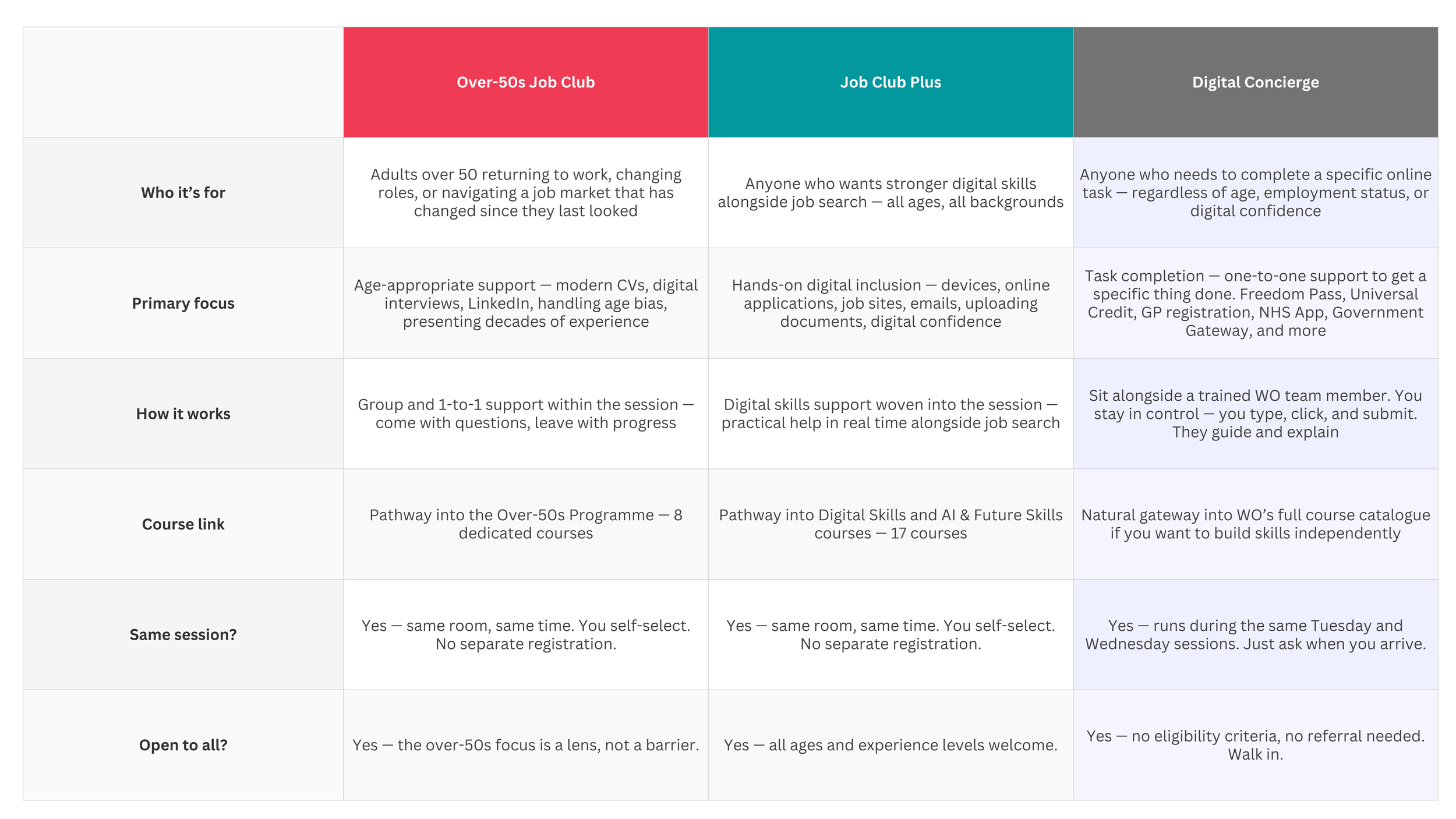 Over-50s Job Club, Job Club Plus and Digital Concierge.