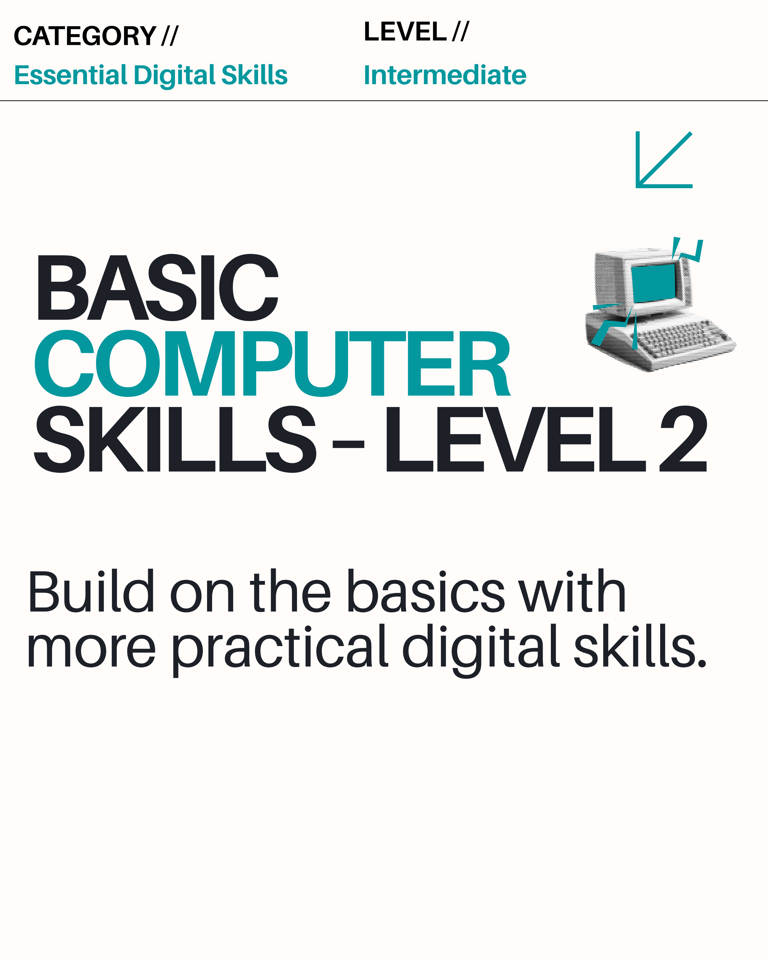 The starting point. Learn how to use a computer confidently — turning it on and off, using a mouse and keyboard, navigating files and folders, and understanding the basics of how a computer works. Perfect if you’ve never used a computer before or have had very limited experience..