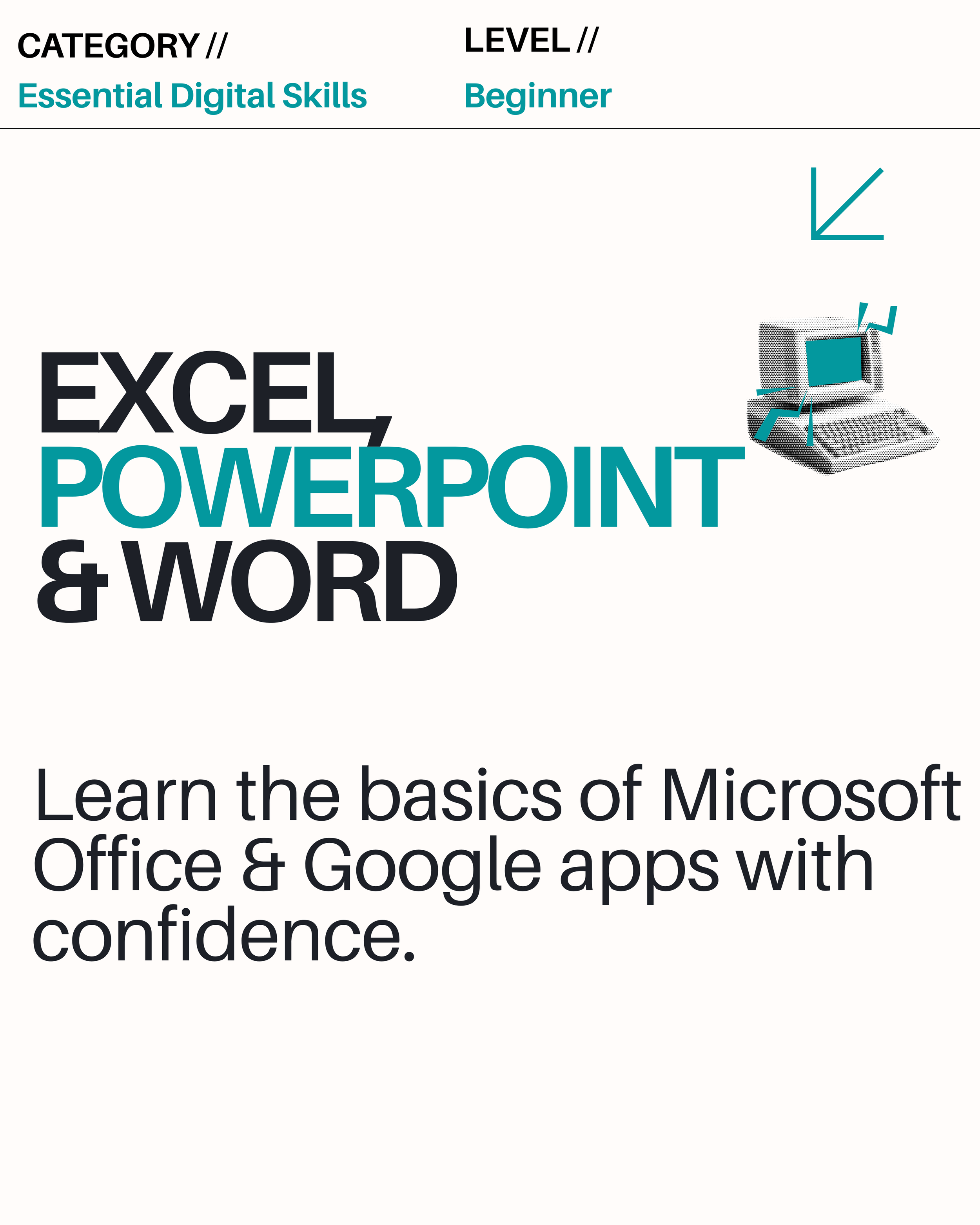 The three tools employers ask for most. Learn to create and format documents in Word, build simple spreadsheets in Excel, and put together a basic presentation in PowerPoint. No experience needed — this course starts from scratch.