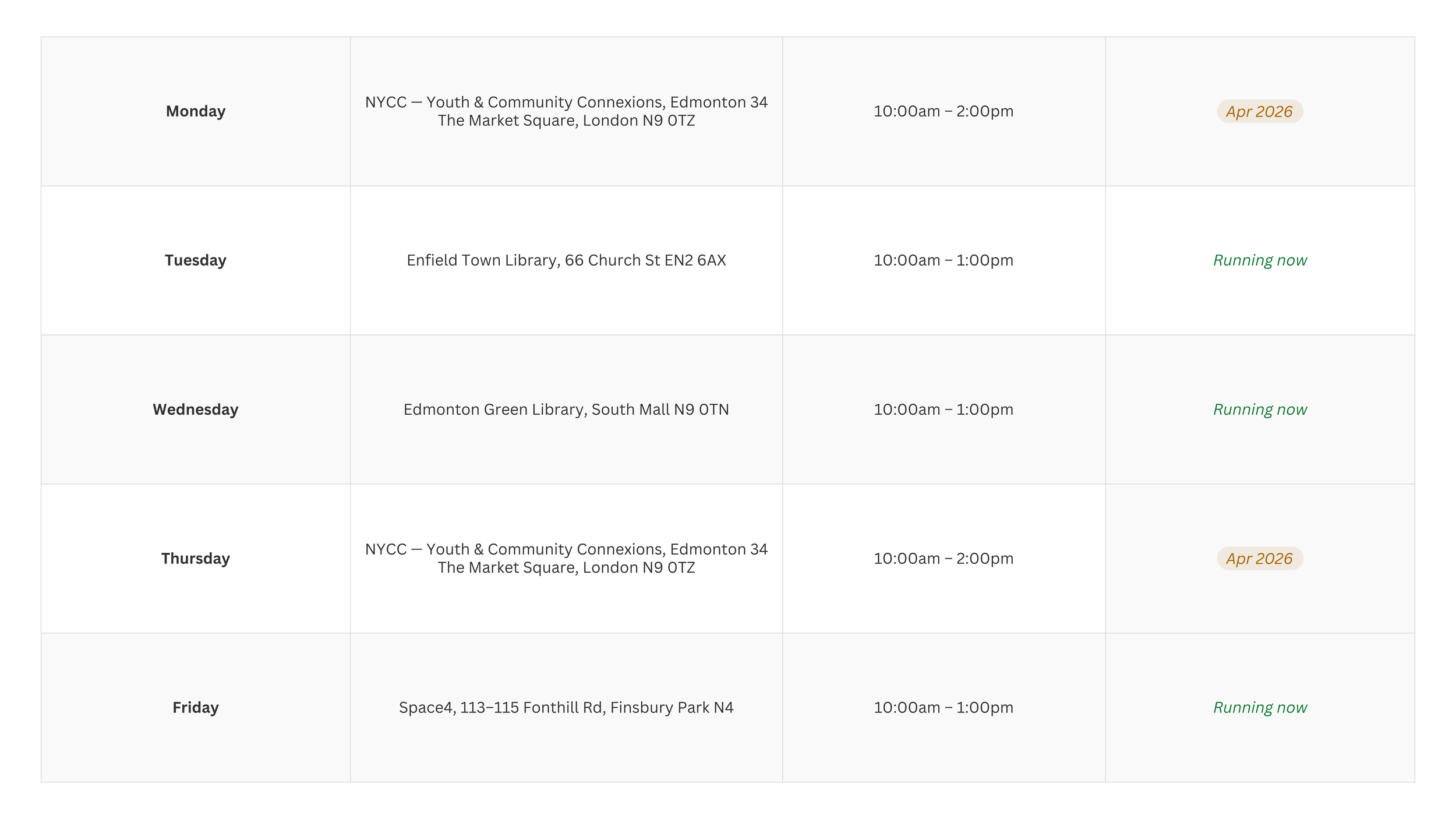 From April 2026, the network runs every weekday. Five days. Multiple venues. Enfield and Haringey. Libraries, co-working spaces, community centres. The same open-access, no-gatekeeping model at every location.